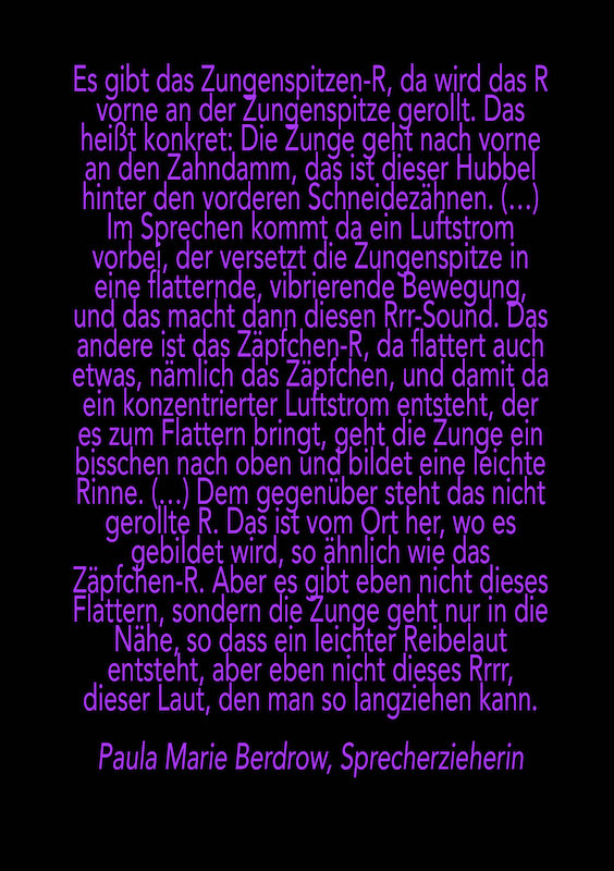 Using found footage, expert interviews and her own textual, vocal and sonic experiments, she explores the complexity of the R sound, the history of its use and its reactionary as well as subversive potential.